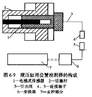 (1)直移式电感检侧器总体结构这种直移式位置检测器由电感传感器、信号变换器及主控器等组成。如图6-9所示,传感器装于活塞杆内部,在恶劣的外部环境里,能通过液压缸?;そ峁咕傻拇衅?,这是该检测器最主要的特点,所以该检测装置特别适应用于如坑道挖掘、冶金铸造、矿山开采、水下开采等工作环境十分恶劣的液压机械设备上。