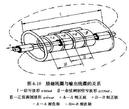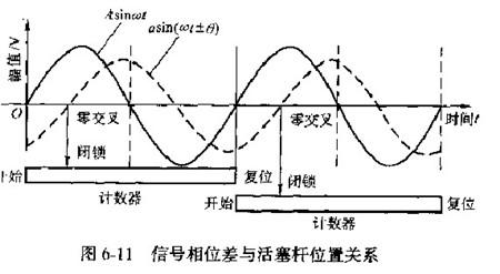 (2)检测器的工作原理如图6-9~图6-11所示,传感器的两层感应线圈的一端与液压缸底部相固定,另一端穿过液压缸活塞进人到液压缸活塞杆内部。传感器移动杆的内部交替装上磁性和非磁性材料,置于液压缸活塞内部与活塞杆相连。当液压缸工作时,传感器移动部分与感应线圈相对位置发生变化,传感器的磁阻也发生改变,感应信号便与基准信号之间形成相位差、再经相应的信号处理,即可得到液压缸活杆的位移量。