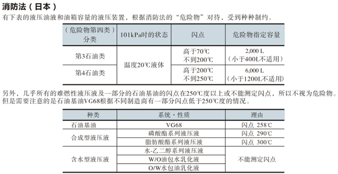 另外,几乎所有的难燃性液压液及一部分的石油基油的闪点在250℃度以上或不能测定闪点,所以不视为危险物。但是需要注意的是石油基油VG68根据不同制造商有一部分闪点低于250℃度的情况。