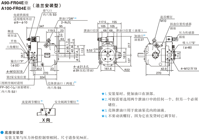A90-FR04E※(法兰安装型)/A100-FR04E※(法兰安装型)油研柱塞泵安装尺寸图: